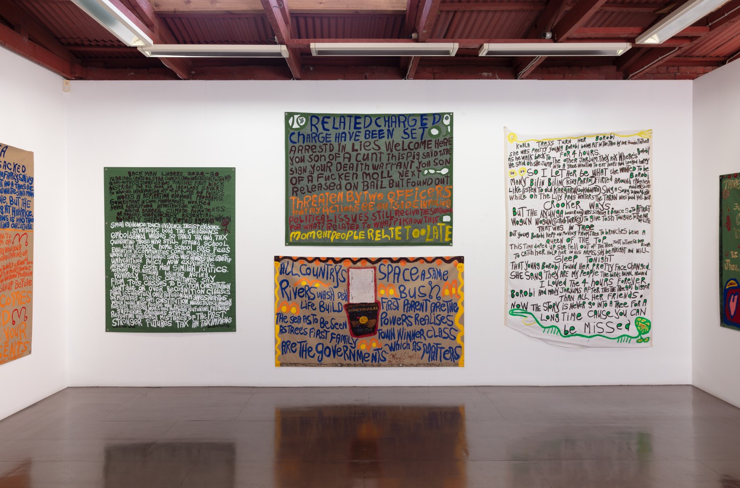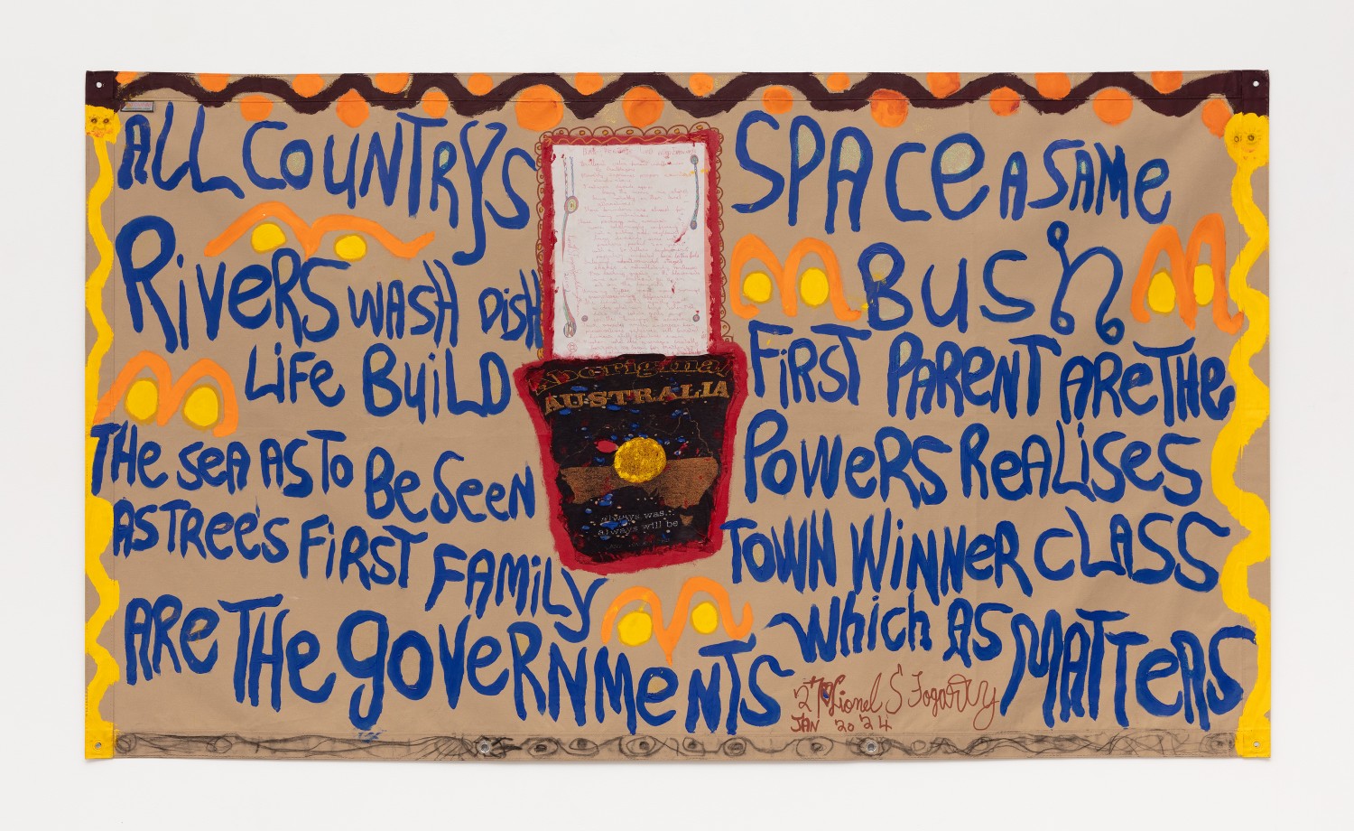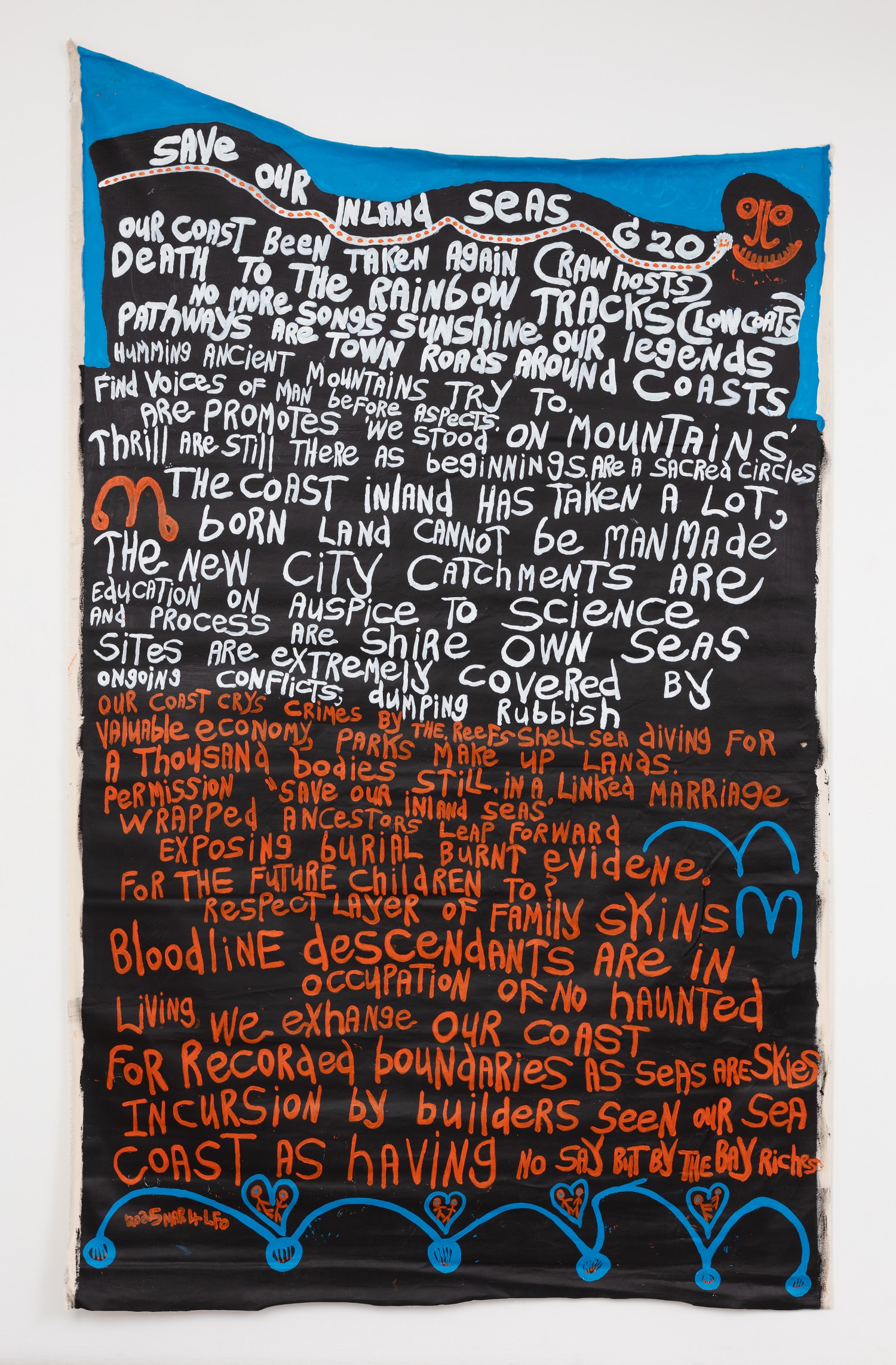 acrylic, fabric and glitter collage on tarpaulin