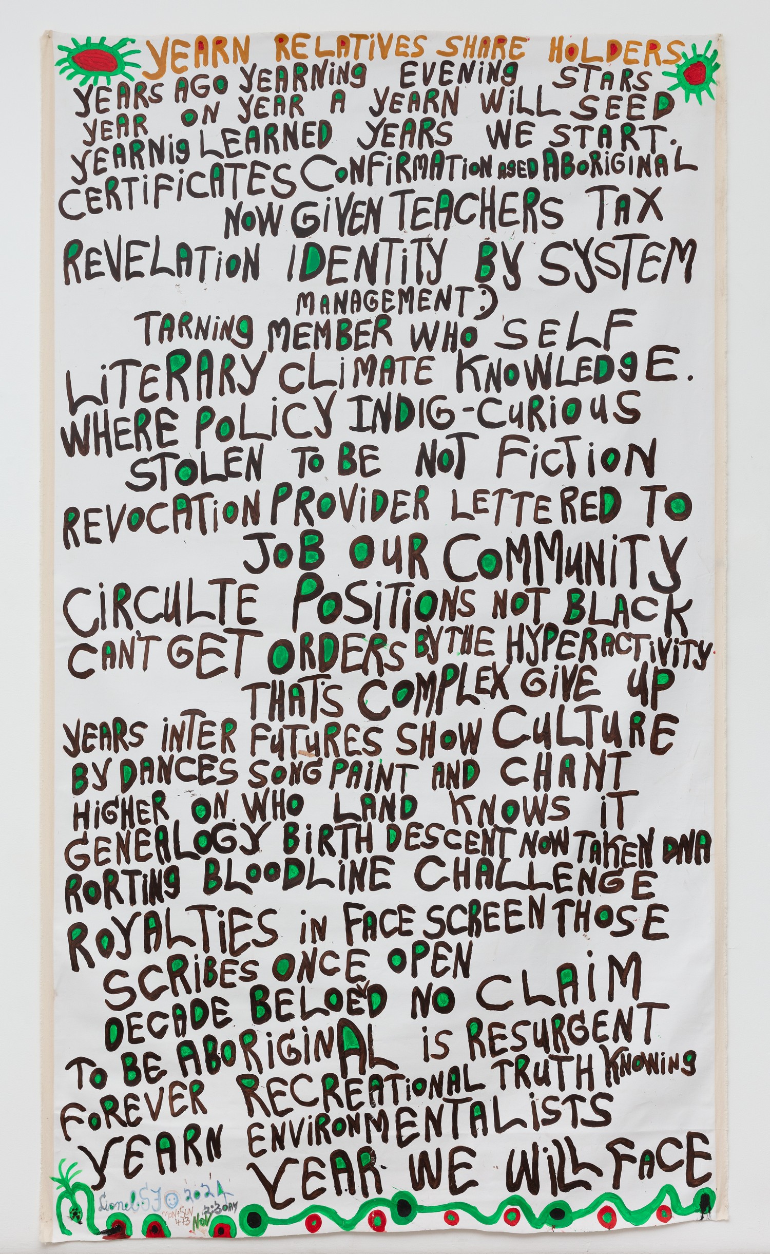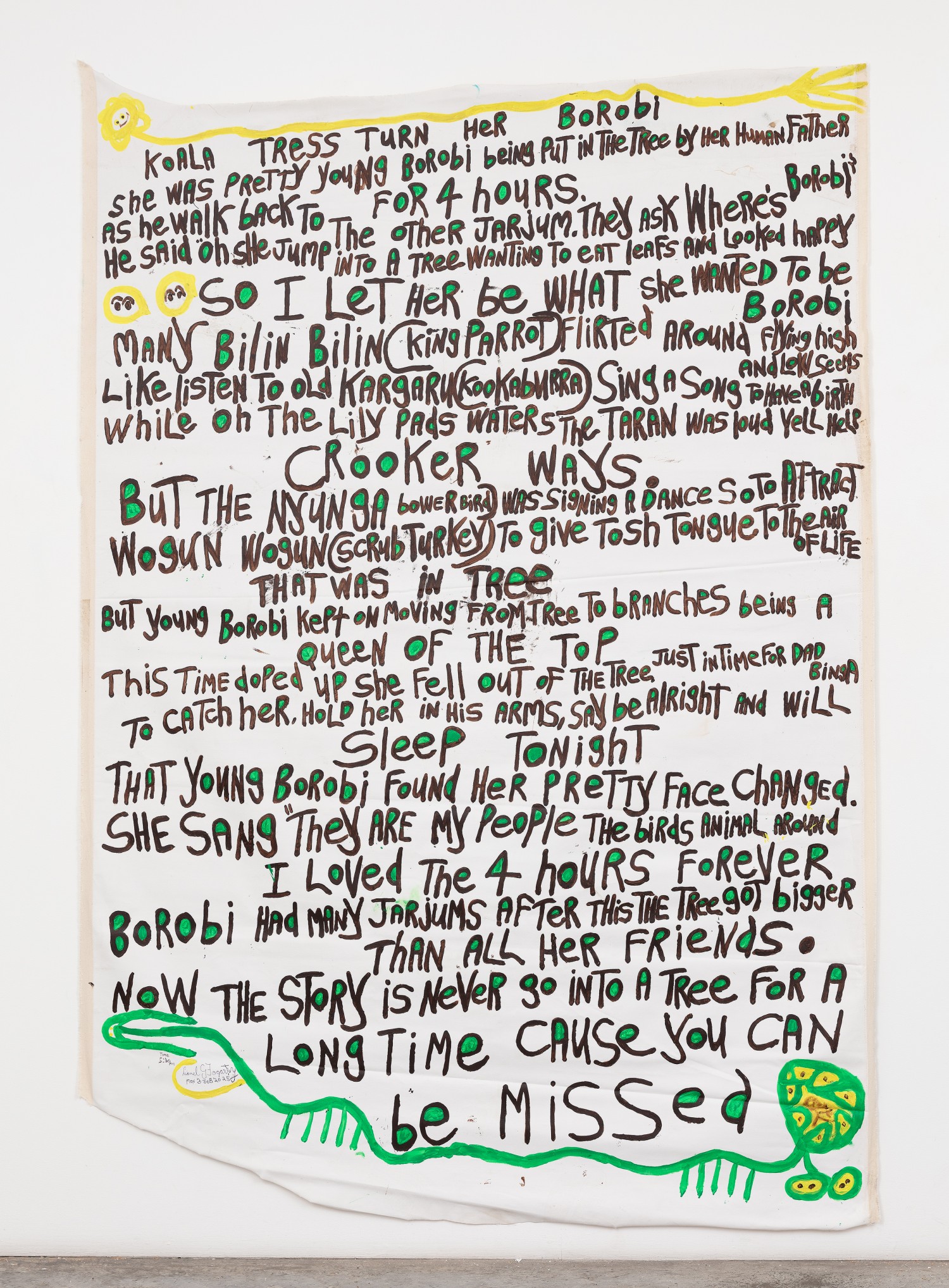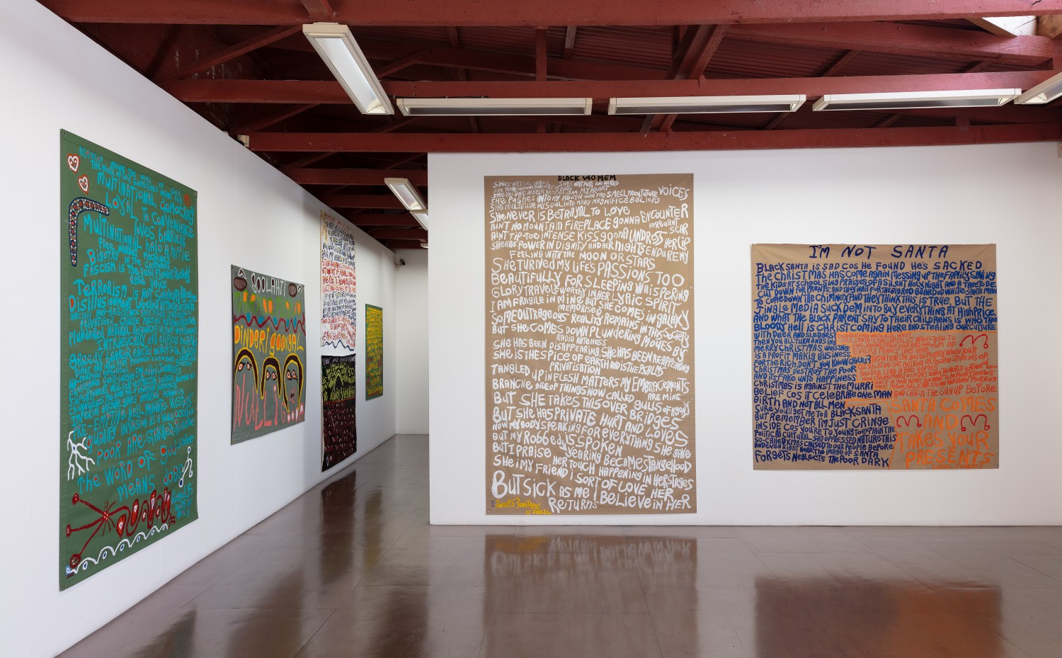 acrylic, fabric and glitter collage on tarpaulin