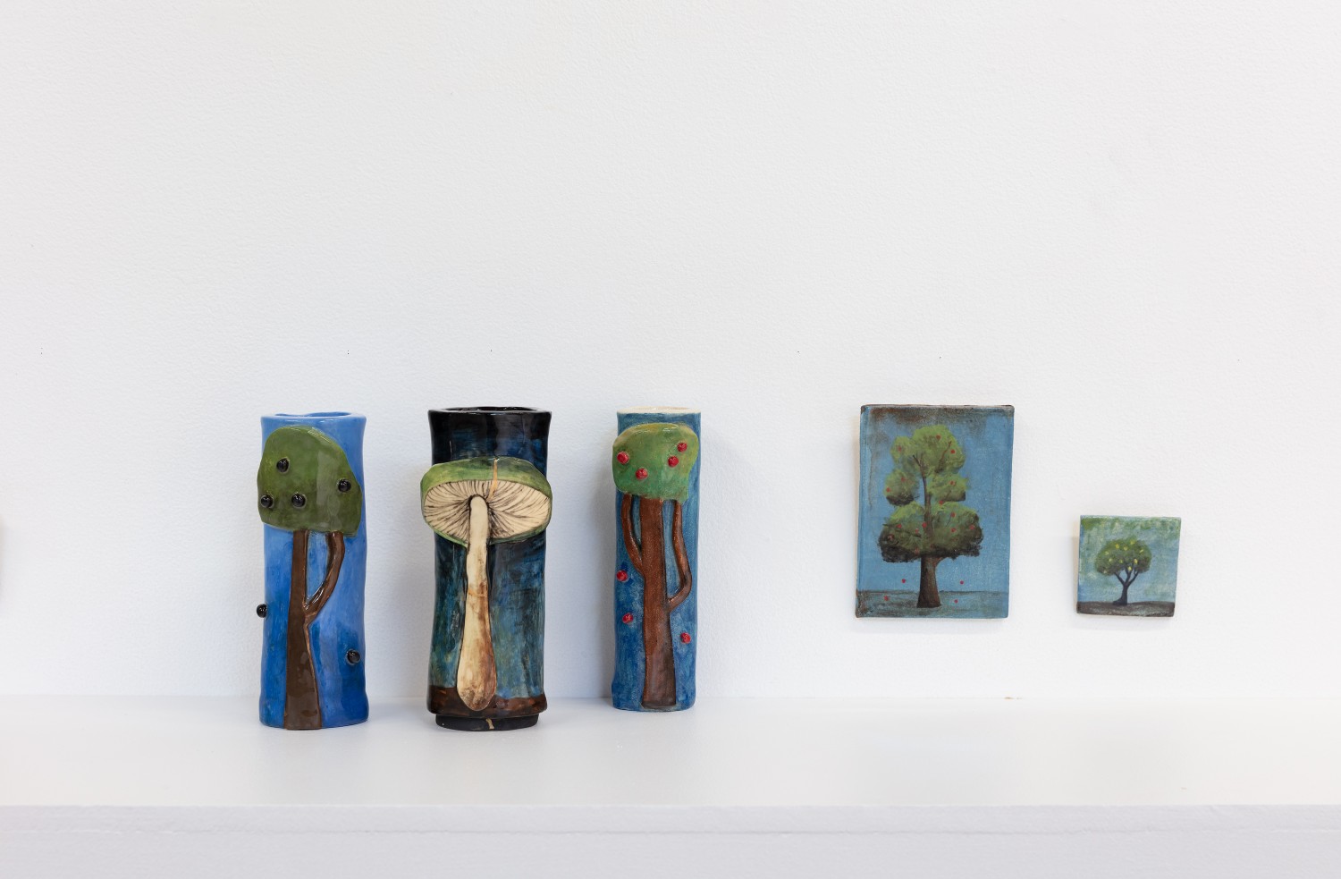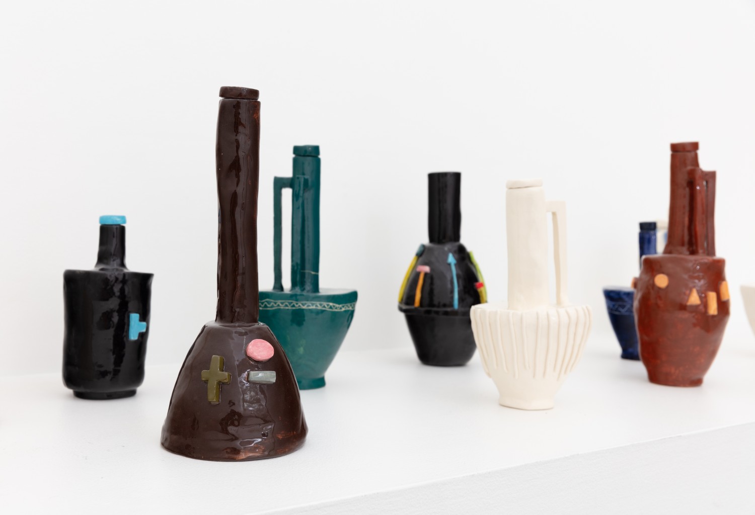 Tall teal-green juglet 2022, Brick red juglet with blue handle 2020, Midnight blue juglet with red handle 2022